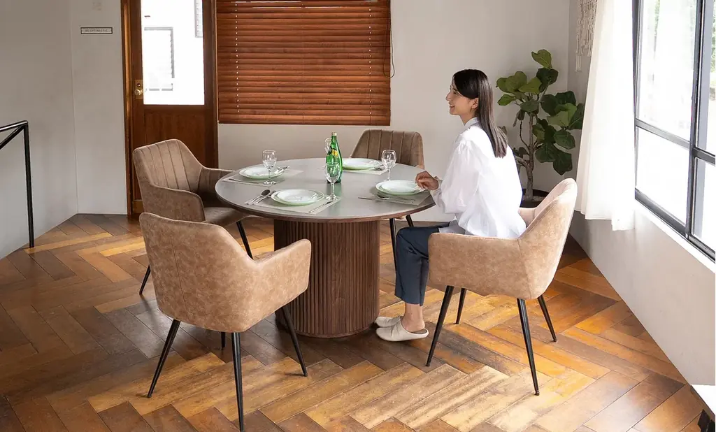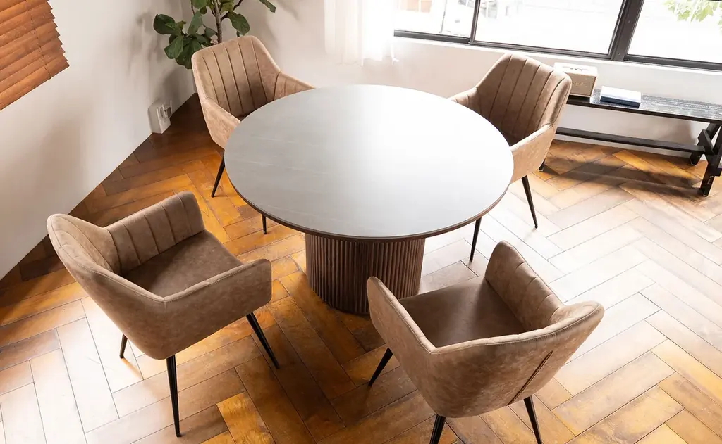 円形(ラウンド)フォルムは、角のない優しい印象を与えるだけでなく、全員の顔が見渡せることで自然な会話を促します。家庭のダイニングに限らず、オフィスのミーティングテーブルやカフェなどの商業空間にも適した汎用性が特徴です。