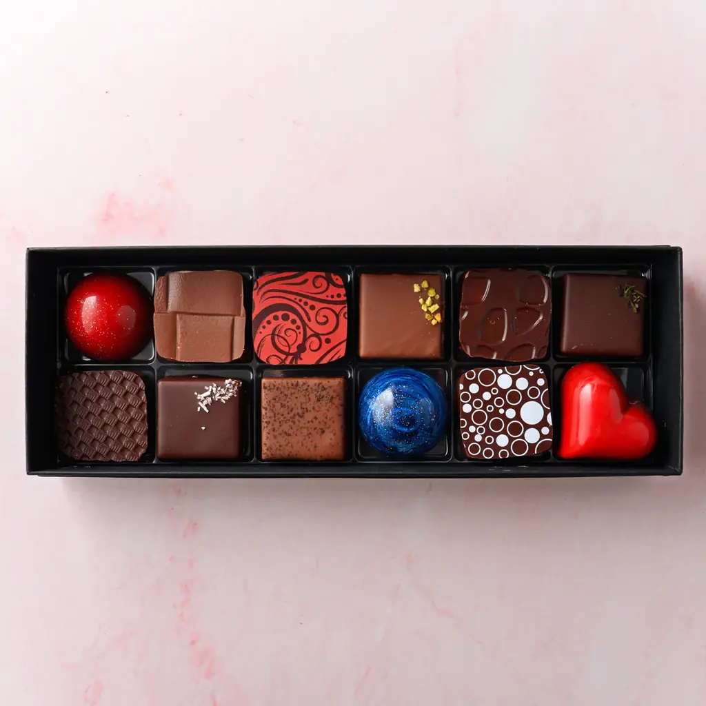 ココフレーズ:クリーミーなホワイトチョコレートをベースにココナッツと苺のガナッシュを詰めた一粒。ミルキーな甘さとベリーの爽やかさが特徴で、友人へのギフトやリラックスタイムに合わせやすいキュートな味わいです。12個および24個のアソートメントに含まれます。アルコール:香り付け程度使用。