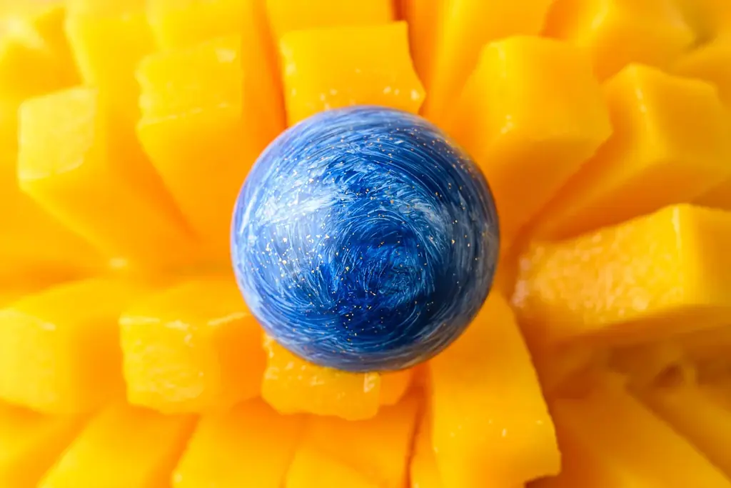バパマンガ(新作):鮮やかなブルーの外観が宇宙から見た地球を彷彿とさせるビジュアルの一粒。南国の香りを閉じ込めたような味わいで、バナナのまろやかな甘みとパッションフルーツの鮮烈な酸味、最後にマンゴーの芳醇な余韻が鼻を抜けます。香り付けの洋酒がそれらをまとめ、完熟フルーツを丸ごと閉じ込めたかのような多幸感を演出します。アルコール:香り付け程度使用。