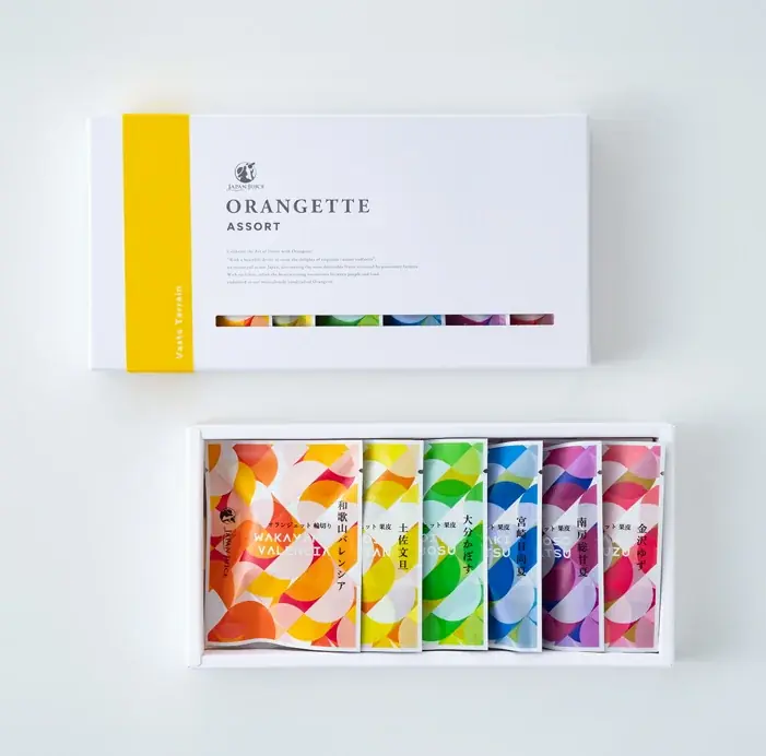 6種の国産柑橘を蜜漬けにし香りと果汁を閉じ込めたピールをダークチョコレートで包んだ商品。甘み・酸味・ほろ苦さが柑橘ごとに異なる風味として楽しめます。外装はカラフルな6色パッケージで、見た目の楽しさも重視した一品です。