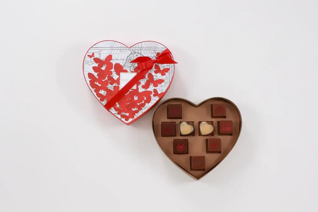 宝石のように美しいハート形のチョコレート。ダークチョコレートで形成した大きなハートの中に、ポップロック、マカダム、ブラウニーの3種のハート形チョコレートを各2個ずつ、合計6個を詰めています。ジュエリーケースのようなボックスに収められ、メッセージカードをハートの中に忍ばせることが可能です。