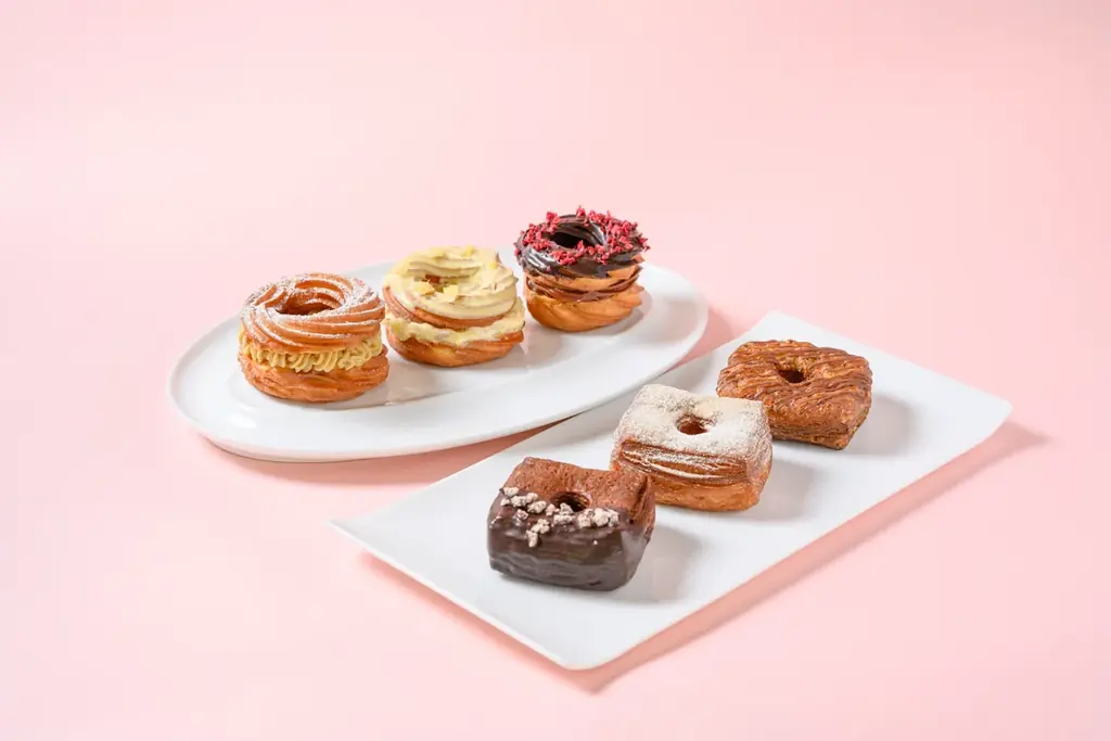 クロワッサンドーナツは幾層にも折り重なる生地が特徴で、外はさっくり、中はふんわりとした食感を目指しています。複数のフレーバーを通期で用意しています。