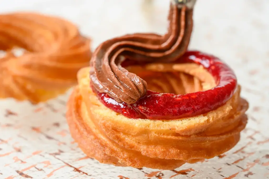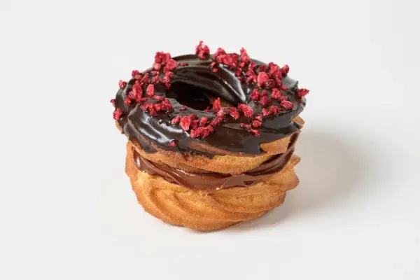 - 1月21日(水)~1月24日(土)限定:マダガスカルカカオ フランボワーズ 550円(税込)。フレンチクルーラー生地にマダガスカル産カカオクリームと自家製フランボワーズジャムを組み合わせた一品。