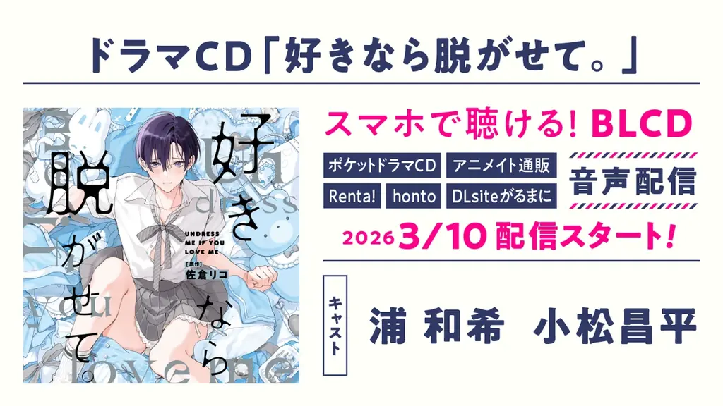 佐倉リコのBLコミックス「好きなら脱がせて。」が、ドラマCDとして2026年3月10日に発売される。制作・発売は株式会社リブレで、原作の持つ〈幼なじみ×女装癖の優等生〉という設定を、声優の演技と音響で補完する形で音声化される。