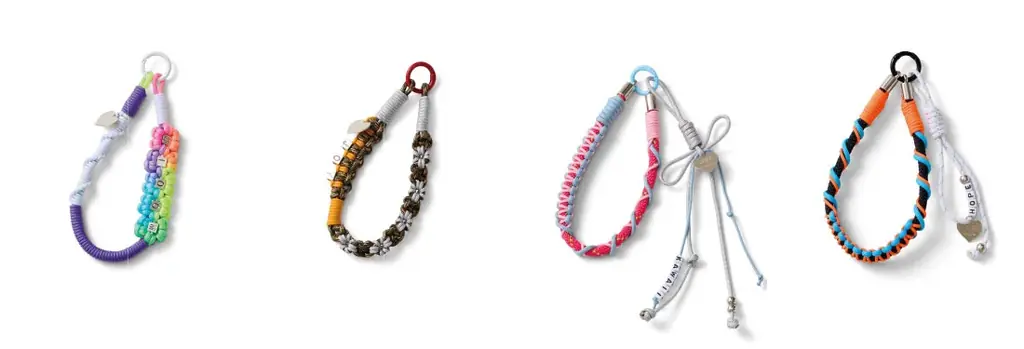 編み物のハードルを感じる方向けに、かぎ針不要でコードを結んで作るショートストラップキットを提供します。宮脇さんがセレクトしたキーワード(例:BLOOM)をレタービーズで編み込み、集めてつなげればロングストラップとしても使える設計です。
