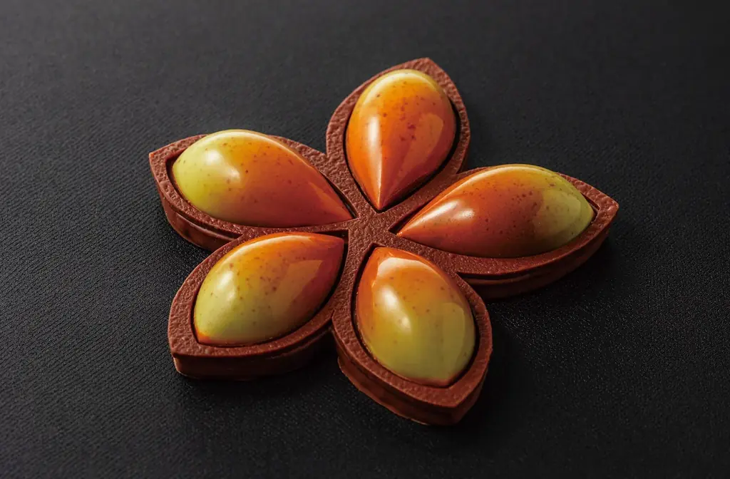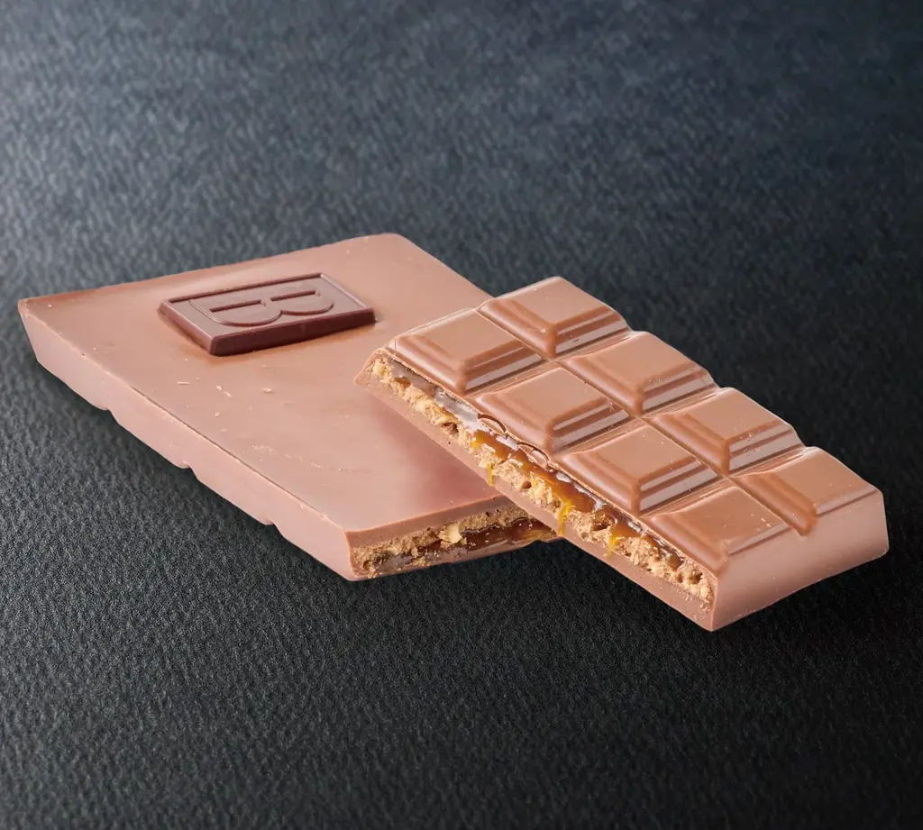 - ベルナシオン タブレット エキゾチック キャラメル レ(1枚)6,696円(税込) — ココナッツとアーモンドのプラリネの上にパッションフルーツとマンゴーのキャラメルの二層をのせ、ミルクチョコレートでコーティングした製品。