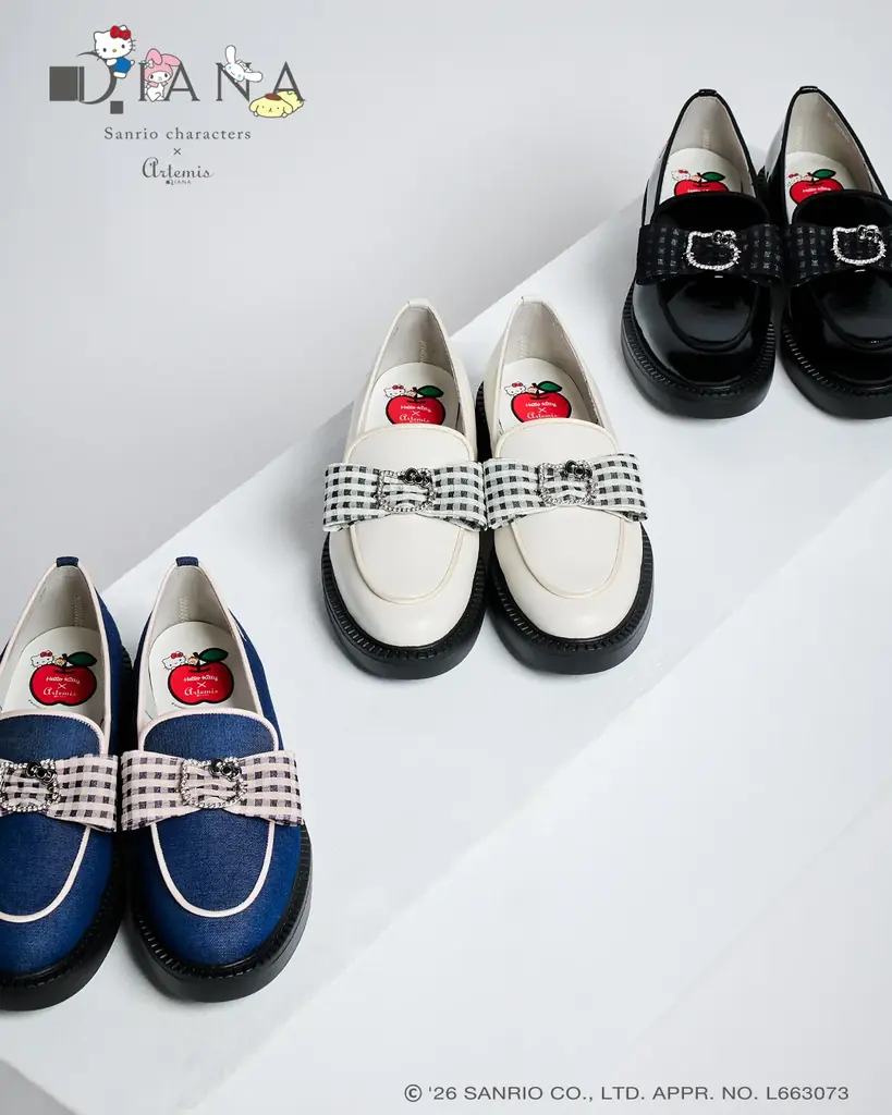 - ボリュームソールローファー 商品番号:RT43701S/価格:¥18,700(税込)/ヒール高:3㎝台/サイズ:22.0-25.0㎝/カラー:ハローキティブラック、ハローキティホワイト、ハローキティブルーデニム。かかと刺繍、中敷きプリントあり。