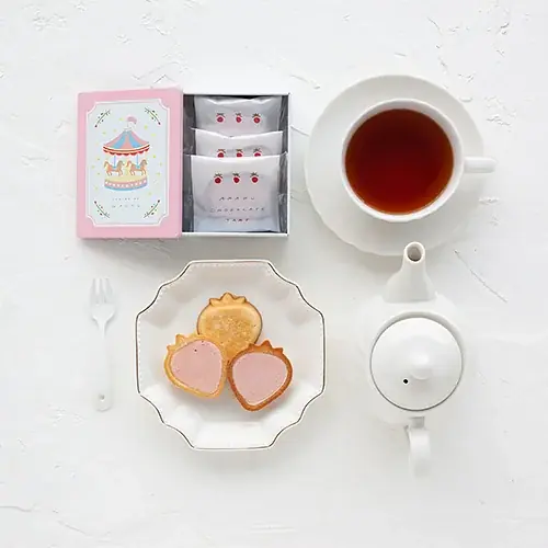 いちご型のタルトに、あまおういちごチョコとホワイトチョコの2層クリームを詰めて焼き上げた商品です。サクッとしたタルト生地と、苺チョコの甘さ・酸味のバランスが意識された一品です。