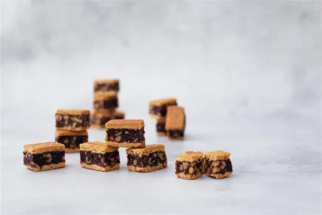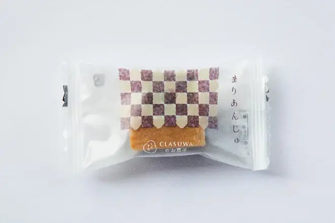 「まりあんじゅ」はくらすわの森のグランドオープンと同時に考案された焼き菓子で、スイスの伝統菓子エンガディナーをベースにくらすわオリジナルの工夫を加えた一品です。特徴的なのは、くらすわが独自に開発した小倉あん「つぶころあんこ」とキャラメル、アクセントとしてのくるみを合わせ、サブレ生地でサンドしている点です。