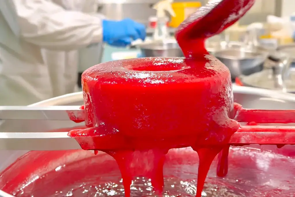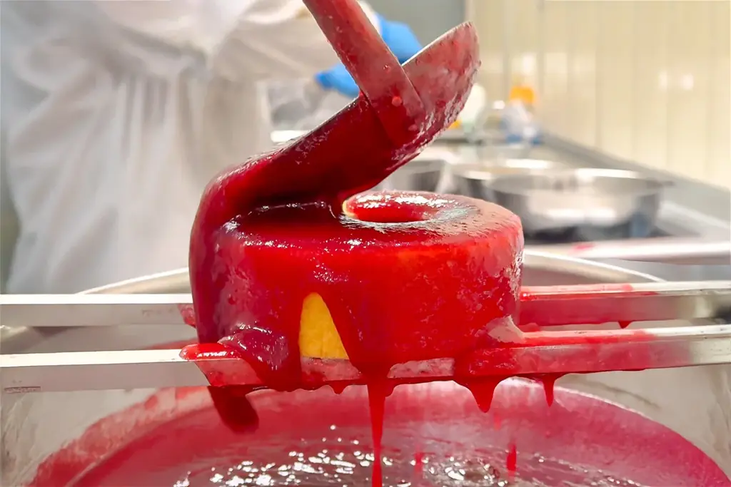 ラズベリーソースにはフランス産ラズベリーを用い、果実含有率90%の濃厚ピューレをベースにシロップを加えたリッチな配合。果肉を丸ごとすりつぶすため、もったりとした濃度と鮮烈な香り、澄んだルビー色が顕著である。