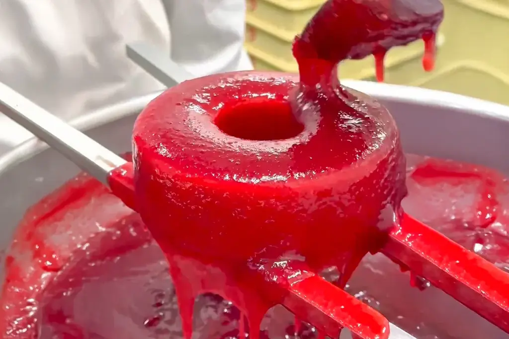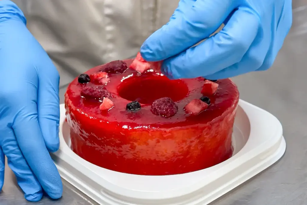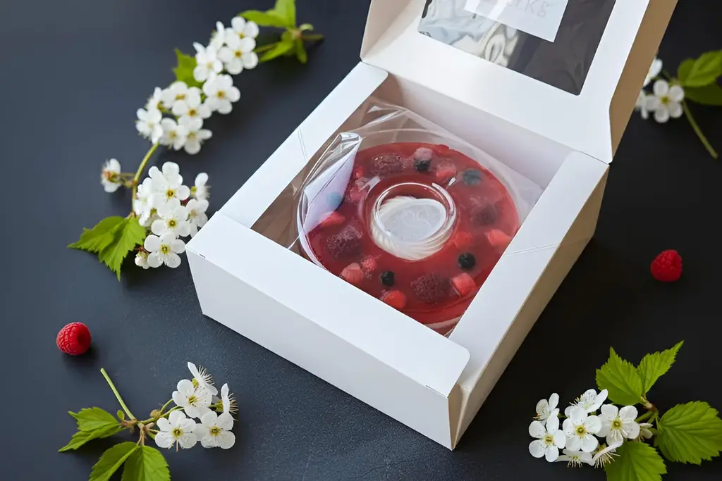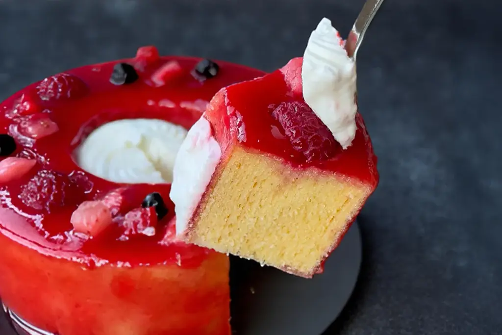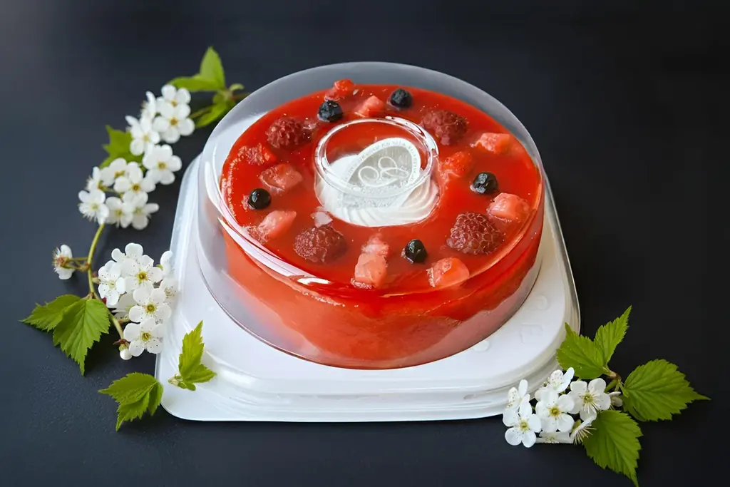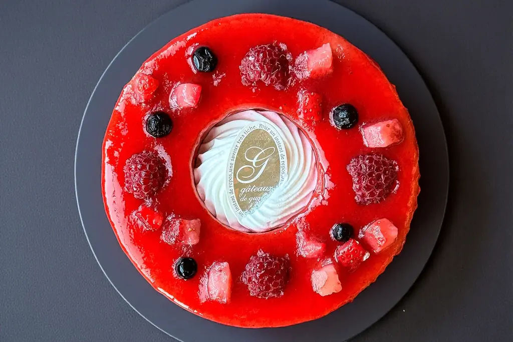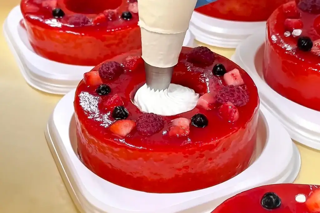 この商品のもう一つの特徴はトッピングに用いられるすべて生のベリー果肉である。加熱ジャムや香料では表現できないみずみずしさ、果汁感、立ち上がる香りがひと口ごとに変化するため、味の奥行きが深い。
