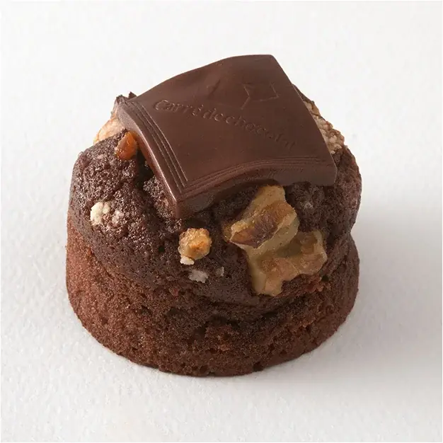 - 商品説明:生地には森永商事のクレオールとヌーベレをブレンドし、フランボワーズとプラリネノワゼットを加えたフィナンシェショコラ。焼き上げ直前に「カレ・ド・ショコラ」をトッピングしたデザインです。