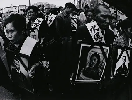 - 《無題(認定患者の遺影を持つ親族たち)》〈水俣〉より(1972年)