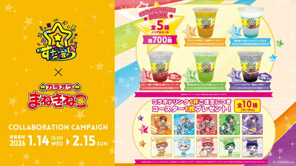 2.5次元アイドルグループすたぽらが、全国展開するカラオケチェーンと期間限定コラボレーションを実施する。株式会社VOISING所属のすたぽらとカラオケまねきねこによる本コラボは、2026年1月14日(水)から2月15日(日)まで全国のまねきねこ店舗で同時開催される。