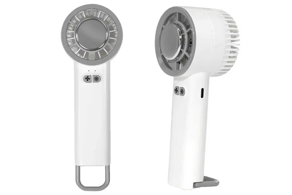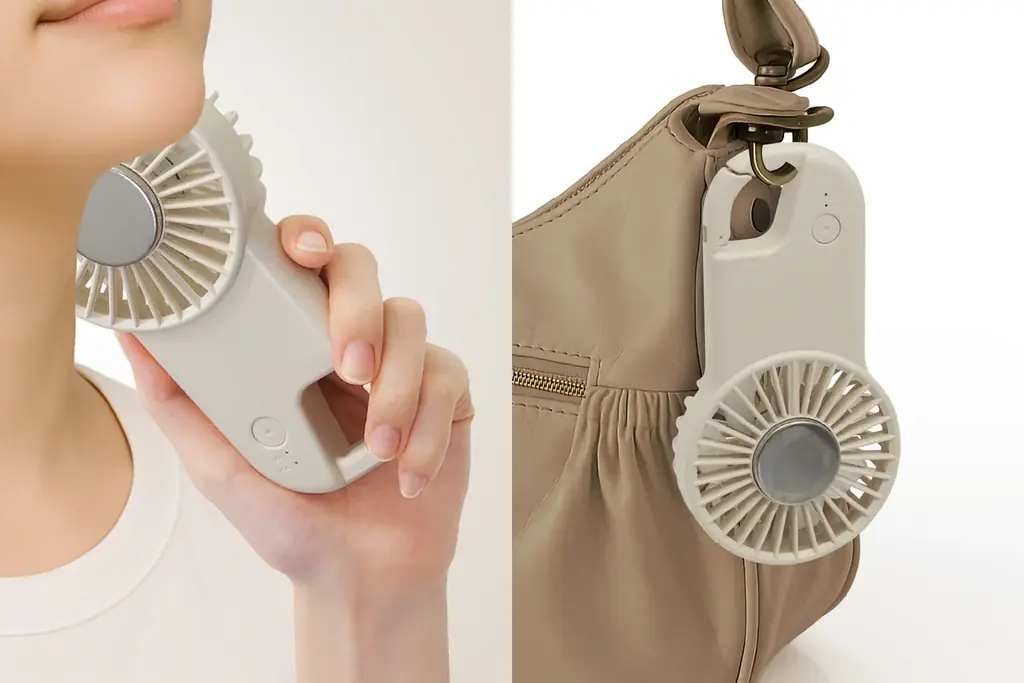カラビナ付きのモデルは、バッグなどに手軽に取り付けられる点を重視した携帯型ファンです。屋外で素早く冷却できる仕様で、通学・通勤・アウトドアでの利用を想定しています。