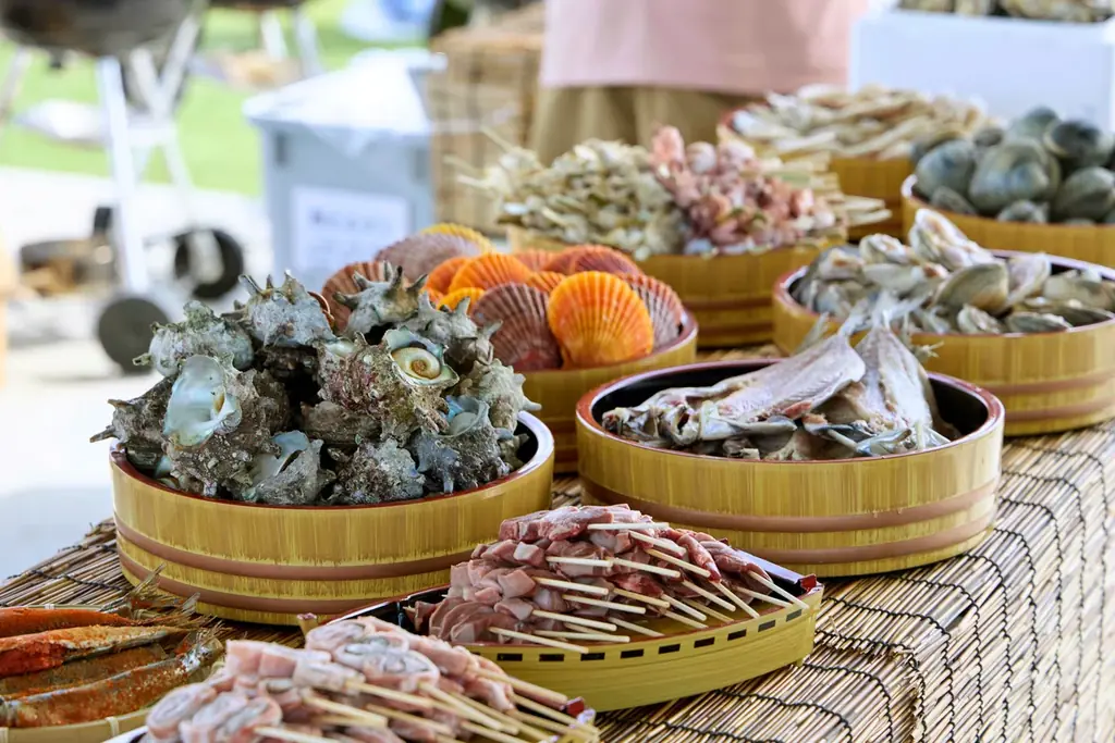 海鮮のみならず、海鮮串や干物、バーベキュー運営のノウハウを生かした肉料理や子ども向けのコーンバターなど、主役級ともいえる多彩な脇役メニューが並びます。海鮮が苦手な利用者や家族連れでも一緒に楽しめるよう配慮されています。