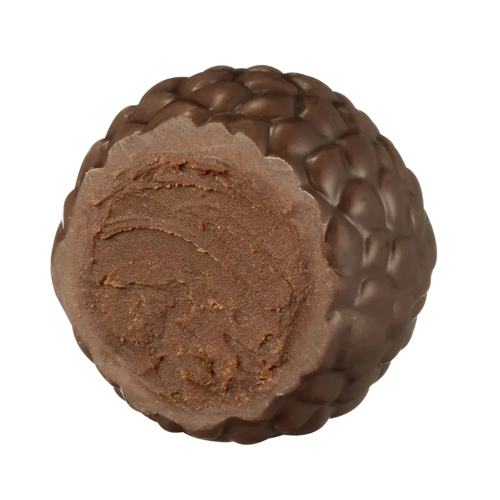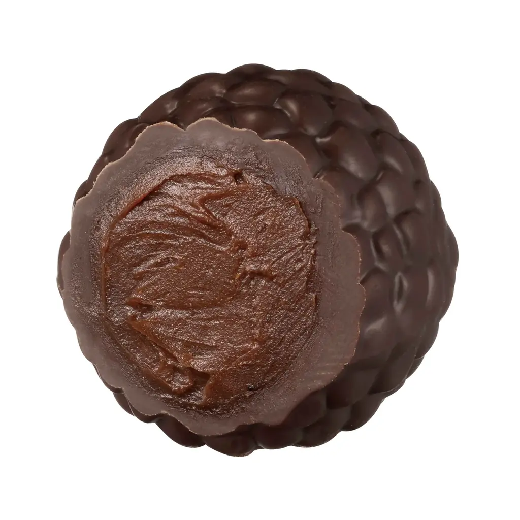 ヤニック・シュヴォローによる「トリュフ エクラ ド ノワゼット」は、まろやかなミルクチョコレートのシェルに、香ばしく濃厚なヘーゼルナッツのガナッシュを封じ込めた一粒です。しっかりとしたナッツの風味とクリーミーな口当たりが特徴です。