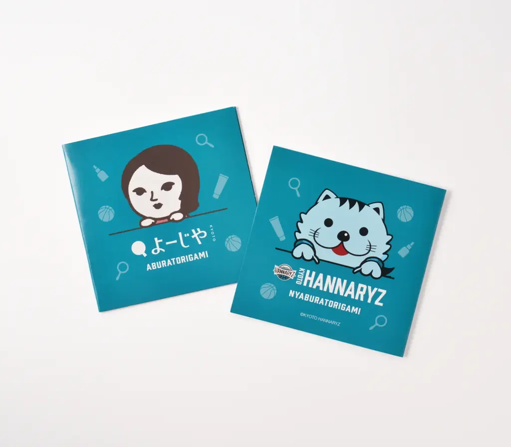 | あぶらとり紙「よじことニャリン ひょっこりver.」 | 800円 | 1冊20枚入り、2冊セット | 表面に「はんニャリン」、裏面に「よじこ」がひょっこりのぞくデザイン。花浅葱色をベースにした限定ビジュアル。 |