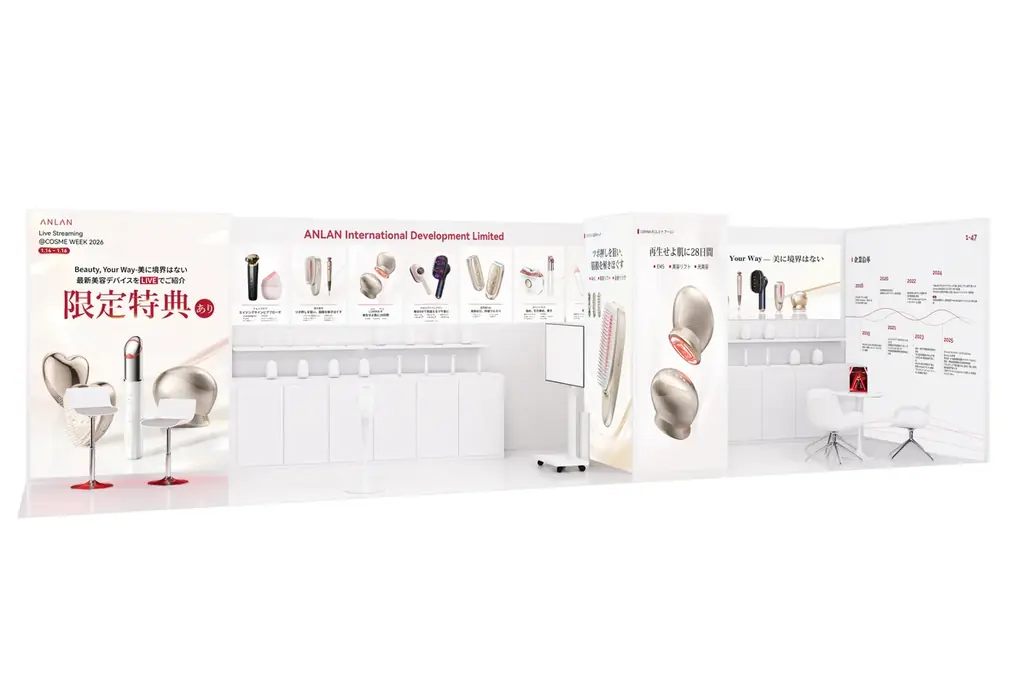 出展では、ANLANが掲げるブランドメッセージ「ANLAN Always for you」を軸に、東洋の伝統美容と現代のテクノロジーを融合させた製品群を、実際に手に取り、試せる形で提示します。会場での体験に加え、同時に実施するオンラインのライブ販売により、来場者のみならず幅広い層へ製品の機能と使用感を届ける構成です。