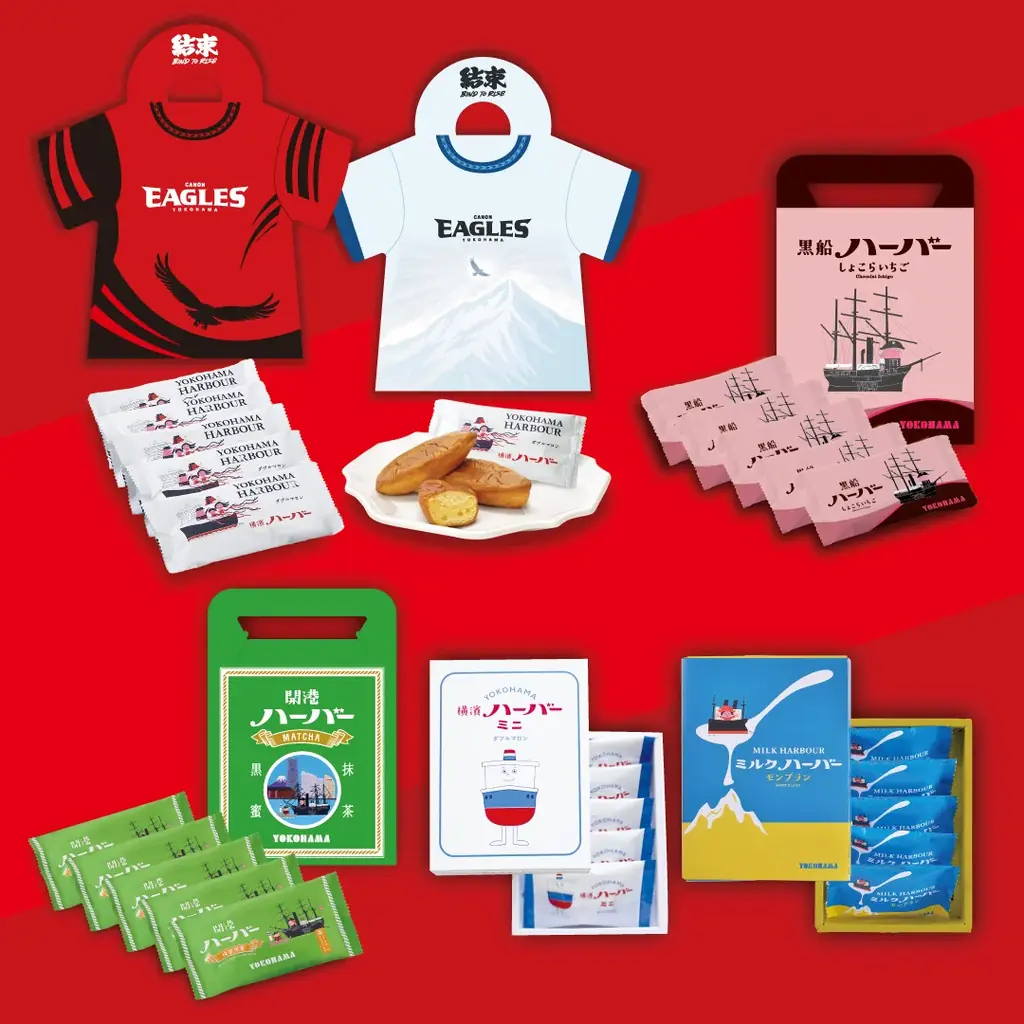 試合当日より発売開始となるのが、横浜キヤノンイーグルスのユニフォームをモチーフにした限定パッケージ商品「横浜キヤノンイーグルスハーバー」です。本商品はパッケージデザインにこだわり、ファンや来場者に向けたコラボレーション商品として展開されます。