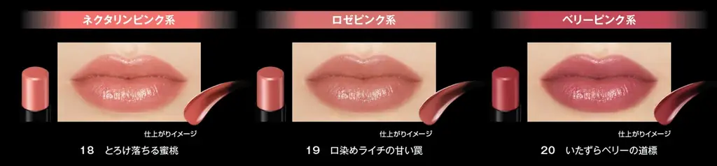 | 新色数(口紅) | 3色(18 とろけ落ちる蜜桃、19 口染めライチの甘い罠、20 いたずらベリーの道標) |