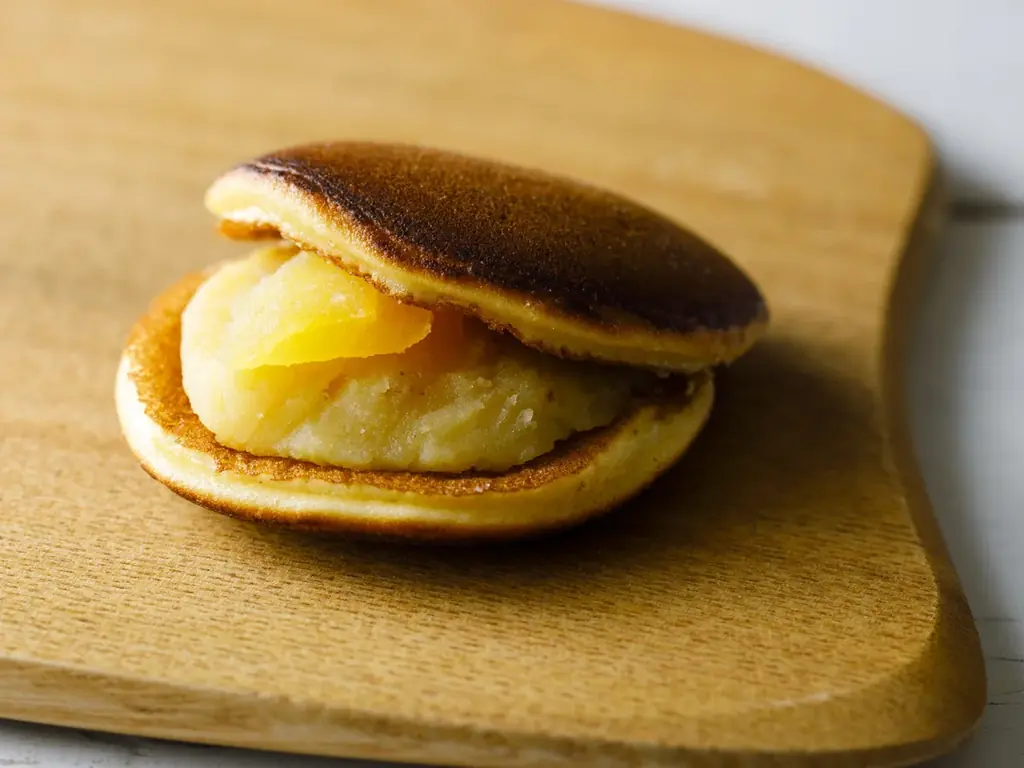 特徴:五郎島金時の餡とりんごのコンポートを挟んだどら焼き。温かく提供することでりんごの香りとさつまいもの甘みが立ち、寒い季節に合う温感と味覚の調和を提供します。