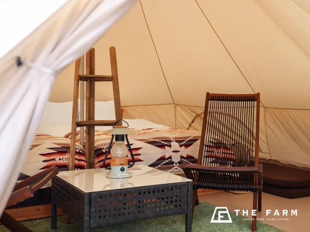 THE FARMグランピングは東日本最大級のグランピングで全7タイプのテントから選べ、テント内は冷暖房完備です。アウトドア初心者でも挑戦しやすい構成でグループ旅行に向いています。