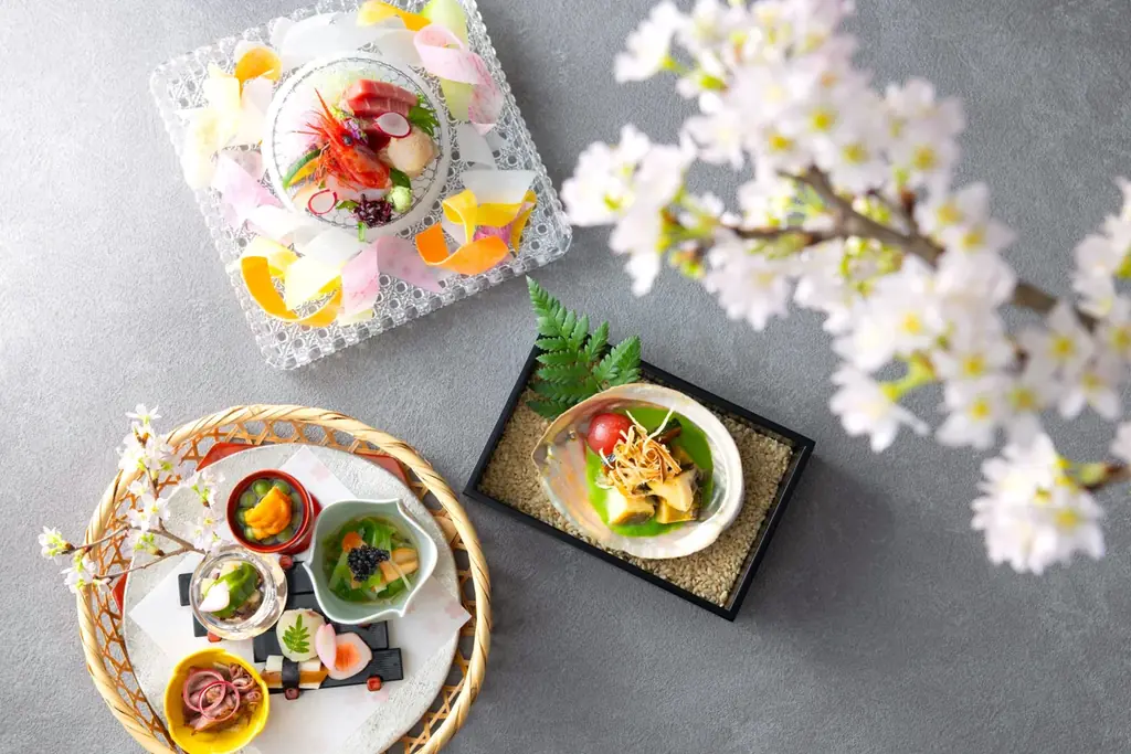 日本料理「水簾」では、春の芽吹きを伝える食材を中心に構成した「花見懐石」を提供します。料理は前菜からお造り、焼物、水菓子に至るまでの全8品で構成され、白魚、筍、うるい、ふきのとうなど、春の味覚が随所に使われます。百合根を桜の花びらの形に仕立てたあしらいが各皿にやさしい彩りを添え、香りや季節感を五感で味わうことを意図した仕立てです。