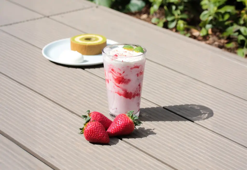- いちごミルク(イートイン:880円 / テイクアウト:864円)— 旬のいちごと北海道産生クリームをブレンドした濃厚なミルクにフランボワーズソースをアクセント。