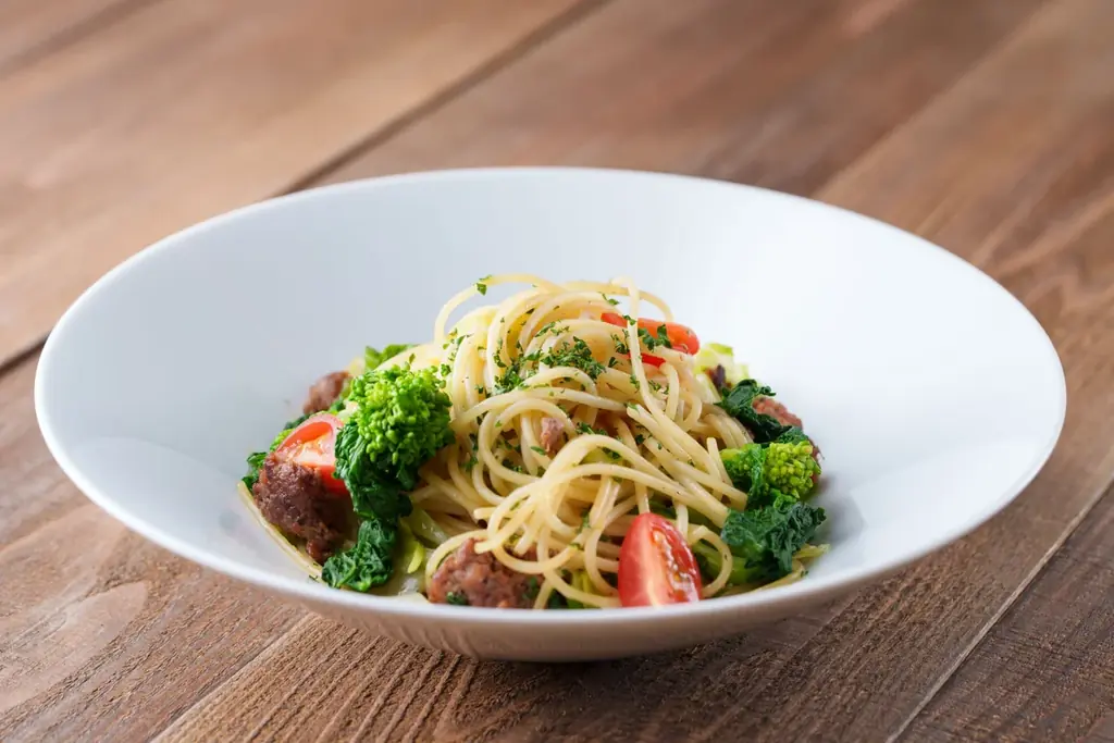 - 菜の花とキャベツ トマトのスパゲッティ — 春の青みとトマトの酸味が調和するパスタ。菜の花のほろ苦さがアクセントとなる一皿。