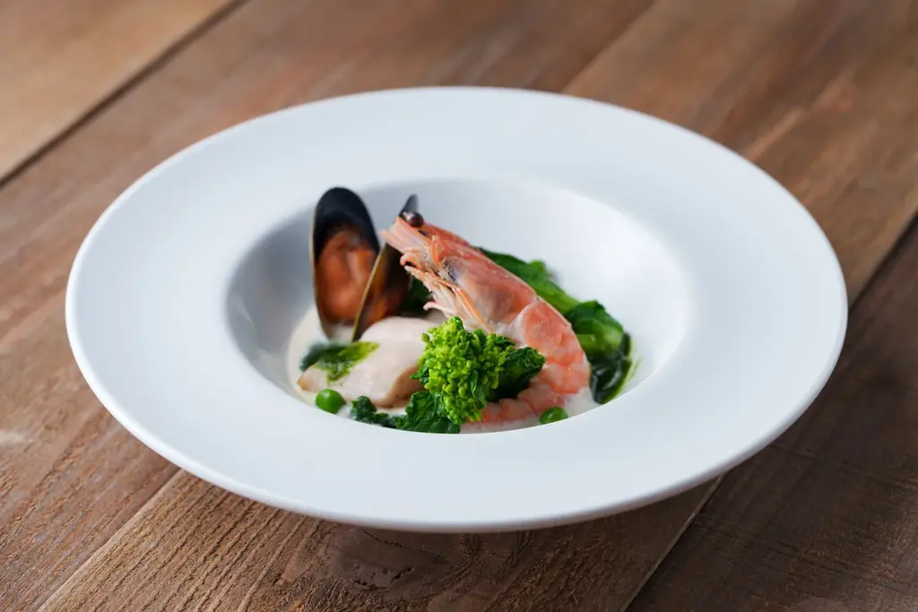 - 白身魚と有頭エビのポワレ ナージュ仕立て — 軽やかなスープ仕立て(ナージュ)で仕上げ、魚と有頭エビの旨味を引き立てる調理法。
