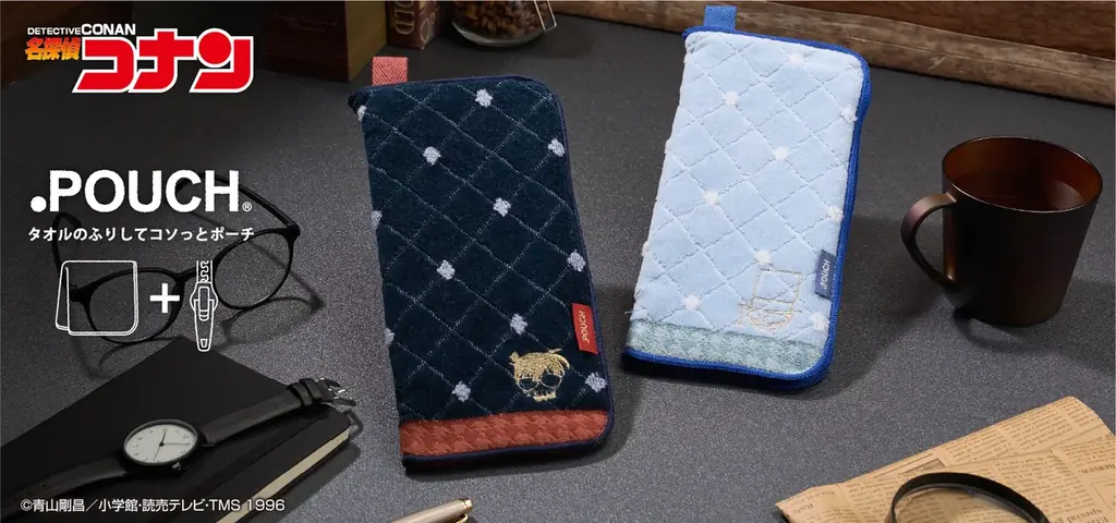 どっとポーチは外見がタオルのように見える布製ポーチで、持ち運びやすさと日常使いの馴染みやすさが特長です。今回は、長年人気を持つTVアニメ「名探偵コナン」から、主人公の江戸川コナン(コナン)とライバル/人気キャラクターの怪盗キッドをモチーフにした2種のデザインが用意されています。
