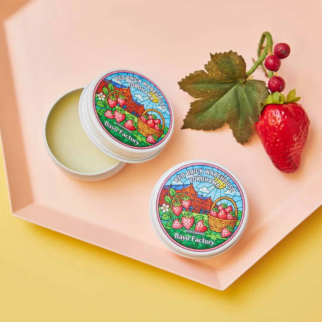 説明:いちごデザインの保湿クリーム。全身に使用できます(横浜赤レンガ倉庫限定、期間限定)。 - KENELE STAND(2号館2F)