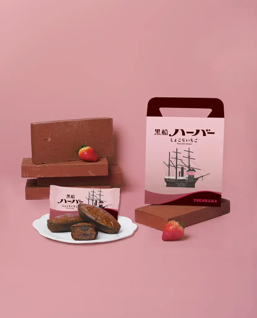 説明:苺の酸味と甘みを活かしたあんと苺ソースをセンターに閉じ込め、ココア風味の生地で包んだしっとりとした焼菓子です。 - ヨコハマズベストコレクション|霧笛楼(1号館1F)