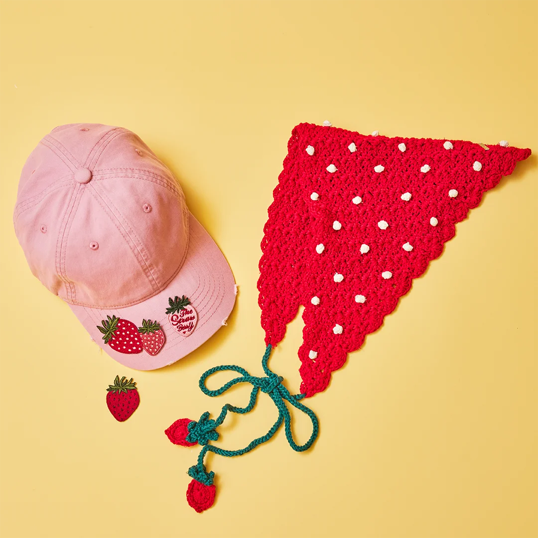 商品:いちごモチーフのワッペン各種(画像左)、いちごちゃんバブーシュカ(画像右)