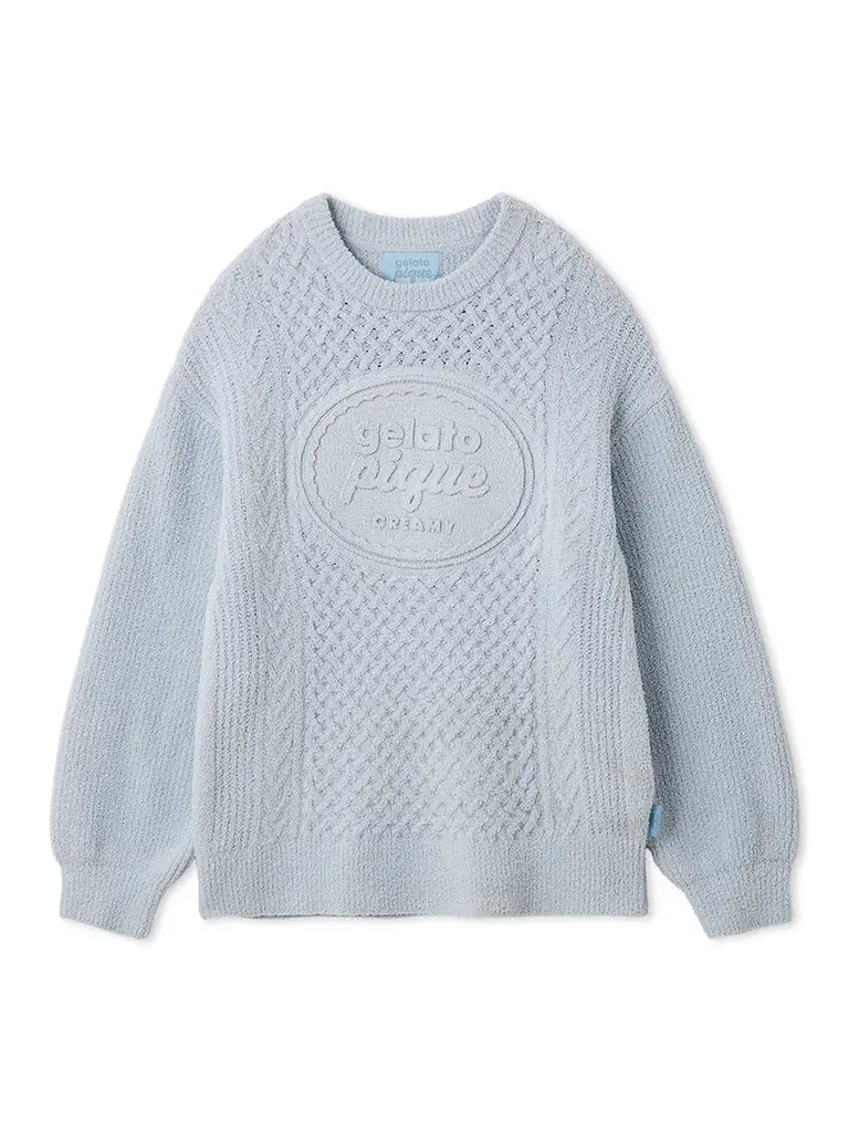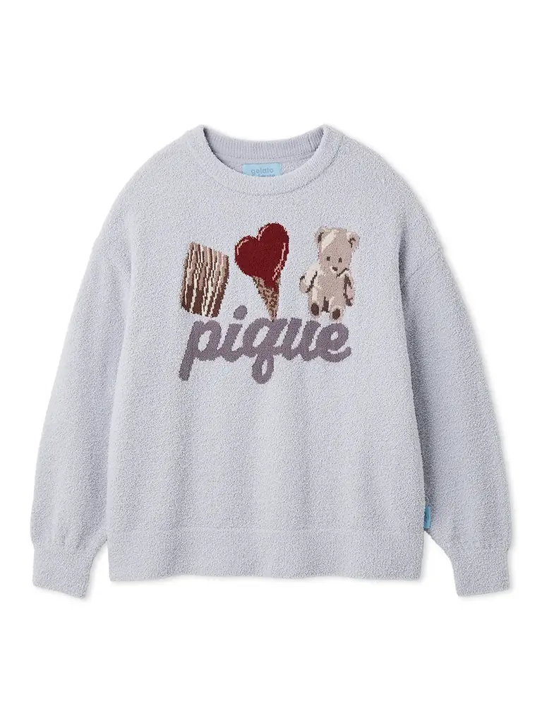 ニットシリーズはベアやチョコレート、ハートアイスなどをワンポイントに施したアイテムと、アイスサンドをイメージしたエンボス加工のロゴ入りアランニットが中心です。編み柄の豊かな表情が特徴で、レディースはピンクとブルー、メンズ向けにはチョコレート色のブラウンを用意しています。
