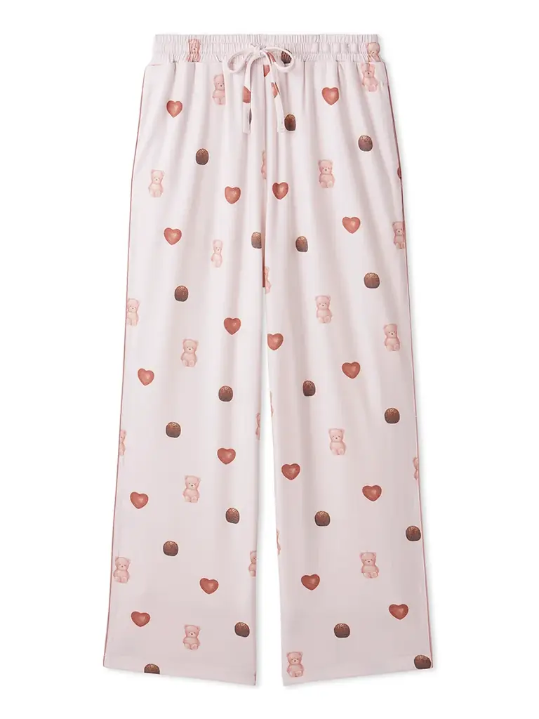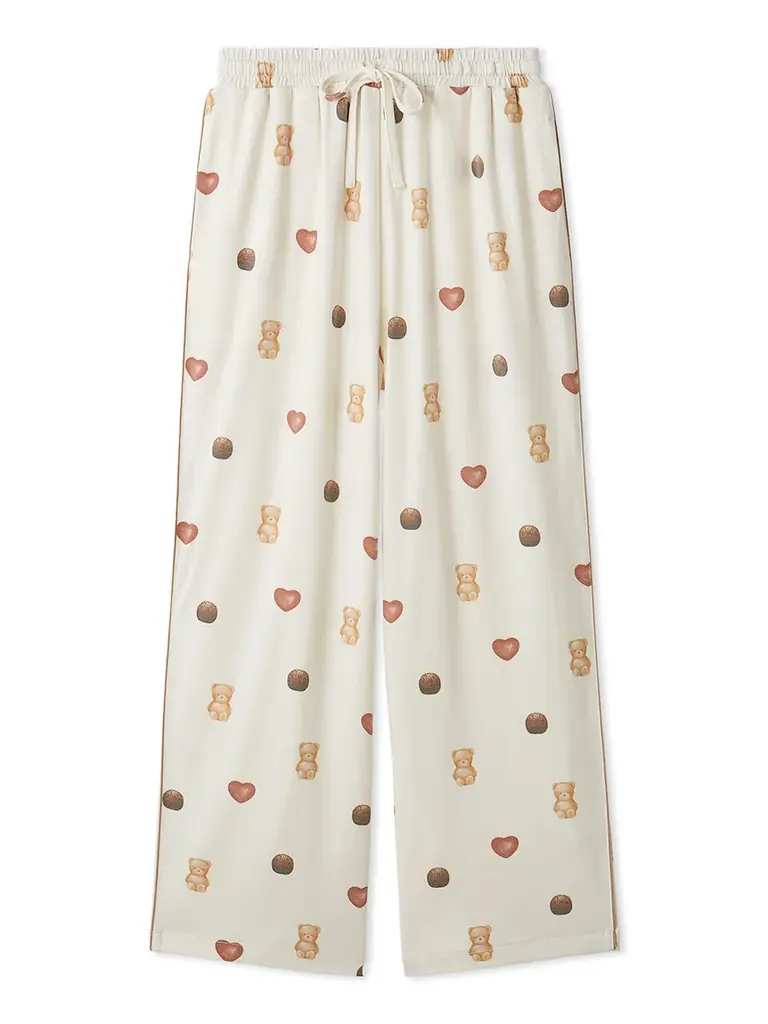 カットソーシリーズはなめらかな肌触りの良い素材を採用し、長袖プルオーバーや総柄シャツ、ロングパンツなどを揃えています。ベアのカップアイスが並ぶ絵柄や、ベア・ハート・チョコレートをモチーフにした総柄が特徴で、カーディガンなどと合わせたレイヤードスタイルが提案されています。
