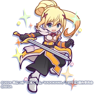 効果:味方全体の攻撃力を4.5倍、体力を3.5倍にし、受けるダメージを20%軽減する。さらに通常攻撃時のみきいろぷよを消した場合、味方全体のスキル発動ぷよ数を4個減らす。 - コラボシリーズ(このすばコラボ)キャラクター