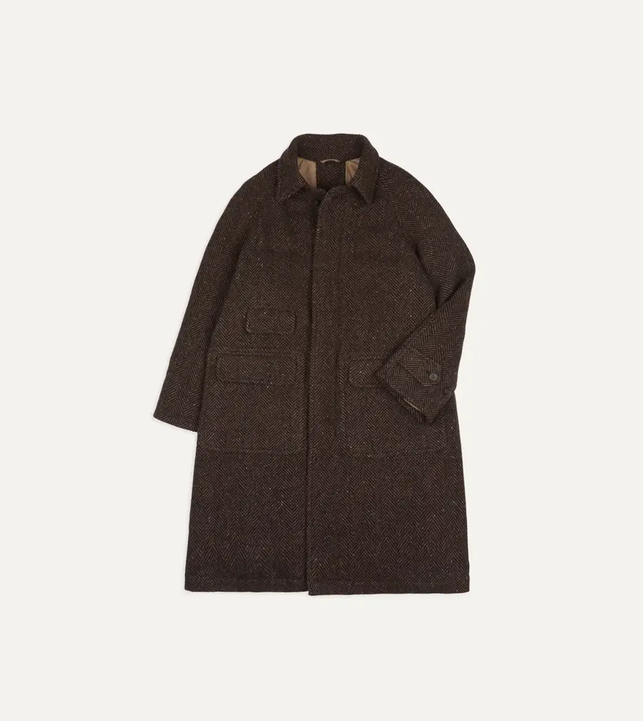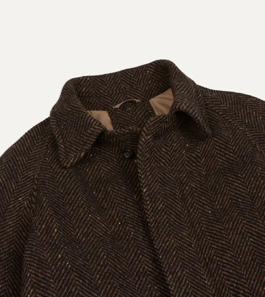 表地にバージンウールのヘリンボーン生地を使用し、ラグランスリーブの仕様を採用しています。裏地にはスペイン産ダックダウンを封入したナイロンタフタのキルティングを用い、上品な表情と高い保温性を両立させています。