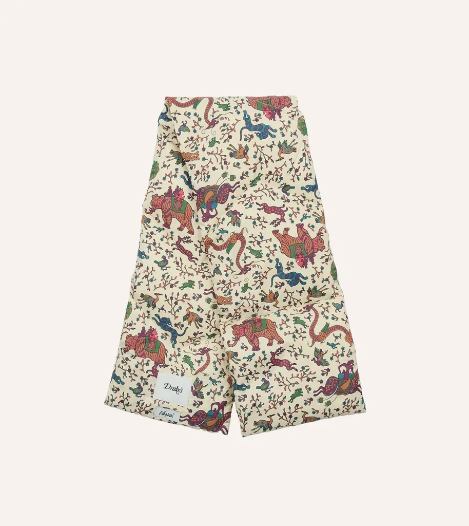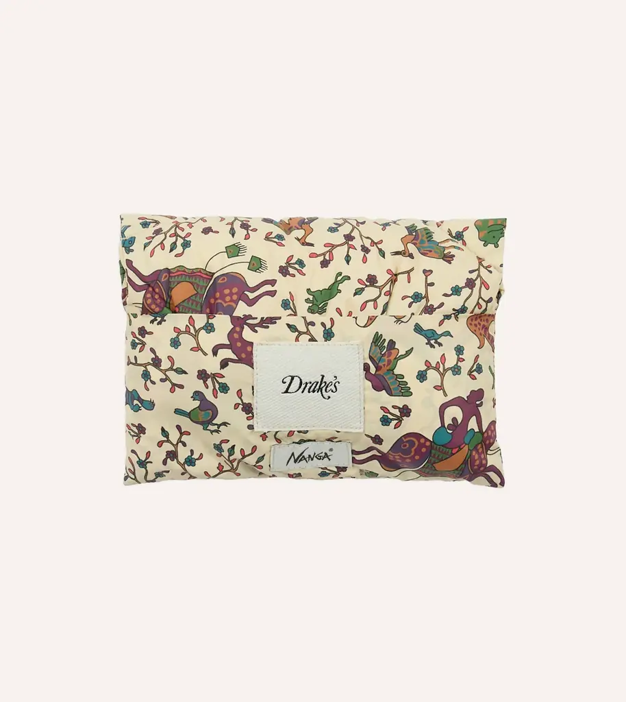 ナンガのポータブルライトダウンマフラーをベースに製作されたキルティッドスカーフです。ドレイクスのネクタイやチーフを想起させるデザインが取り入れられており、両ブランドのアクセサリーに対する文脈が反映されています。