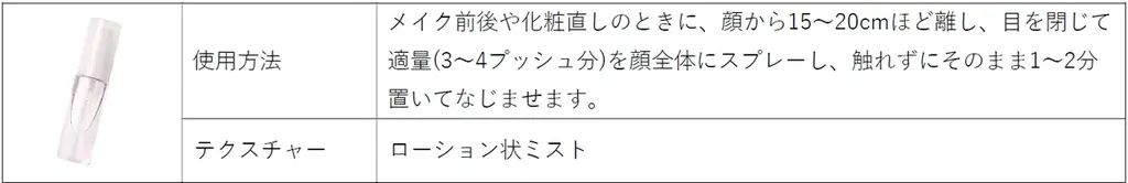 | シルキーフィニッシュミスト(花澄香) | ミニ(約1か月分) | メイク仕上げ用、うるおい成分配合 |