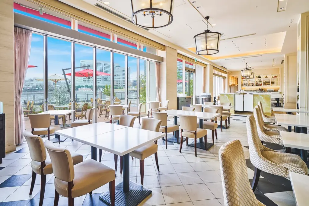 店内には桜の装飾が施され、みなとみらいの海を望む大きな窓とともに、水辺と桜の景観がフェアの世界観を強調します。春には窓越しに汽車道の桜が見頃を迎えるため、季節ならではの風景とともに食体験を提供します。写真はイメージです。