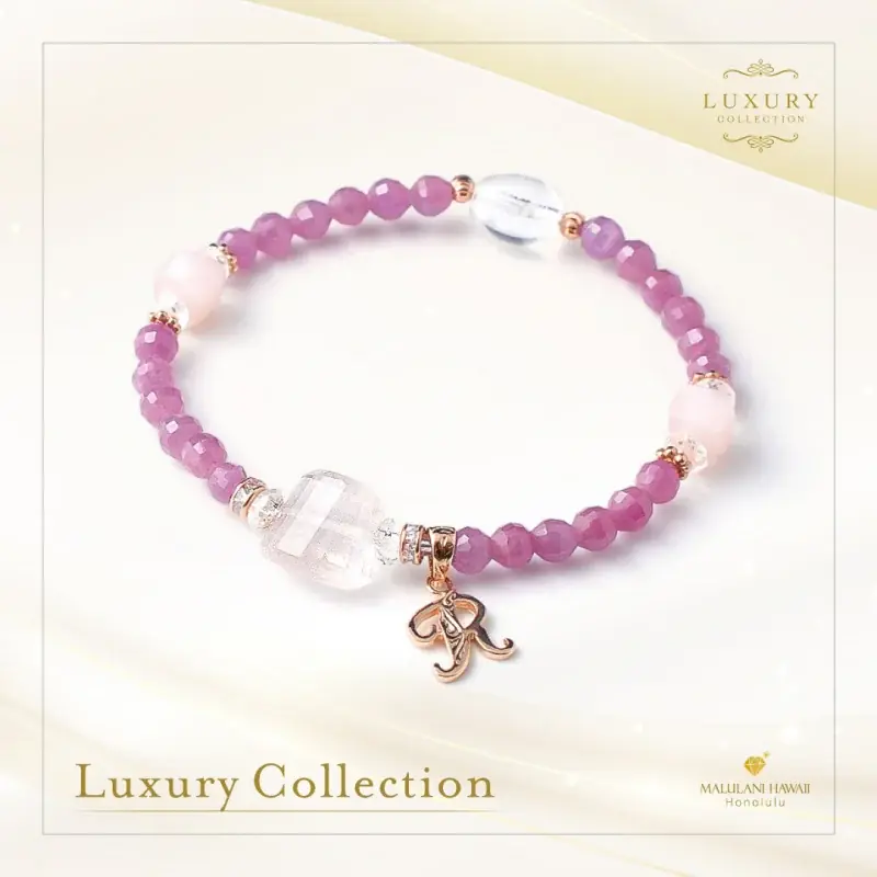 説明:女王ルビーを使用し、天性の魅力と美しさを引き出す石とハワイアンジュエリーを組み合わせたブレスレット。永遠の愛、カリスマ性、幸福、成功のお守りに。