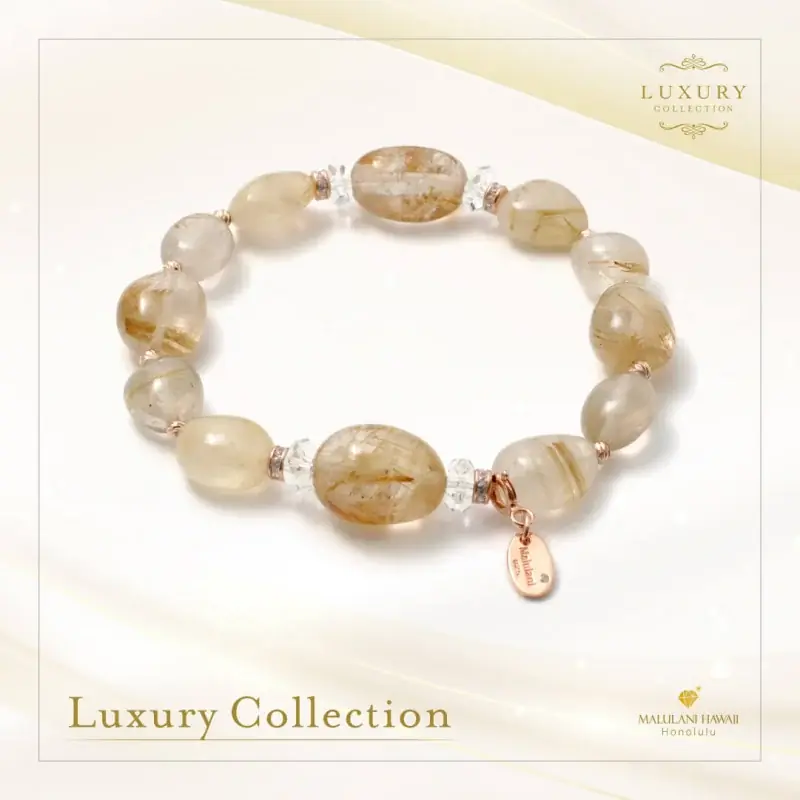 説明:黄金にきらめくルチルを使用した至極のブレスレット。金運、成功、勝利、良縁、繁栄、カリスマ性、厄除けのお守りに。