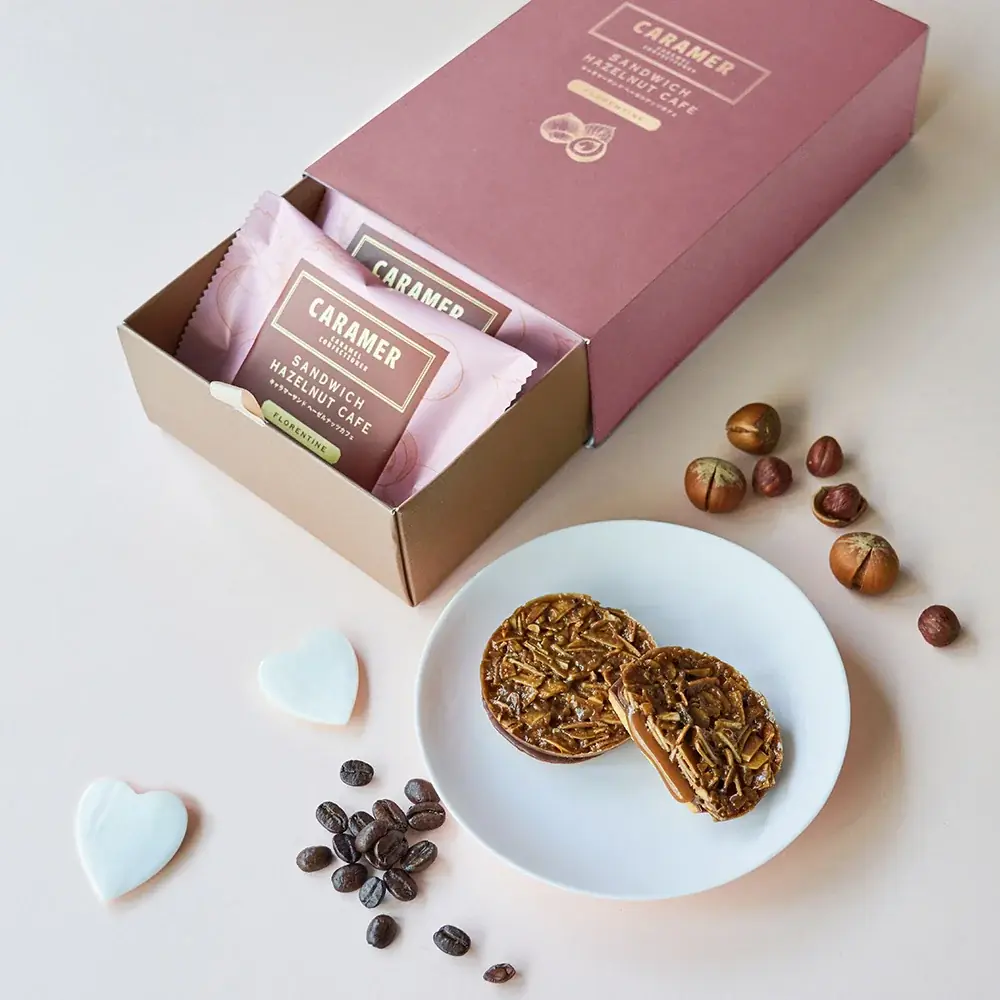 - キャラマーサンド(3・5・10個入)、キャラマーサンド ヘーゼルナッツカフェ(5個入)、キャラメルブラウニー(3個入)、CARAMERギフトボックス(6個入)