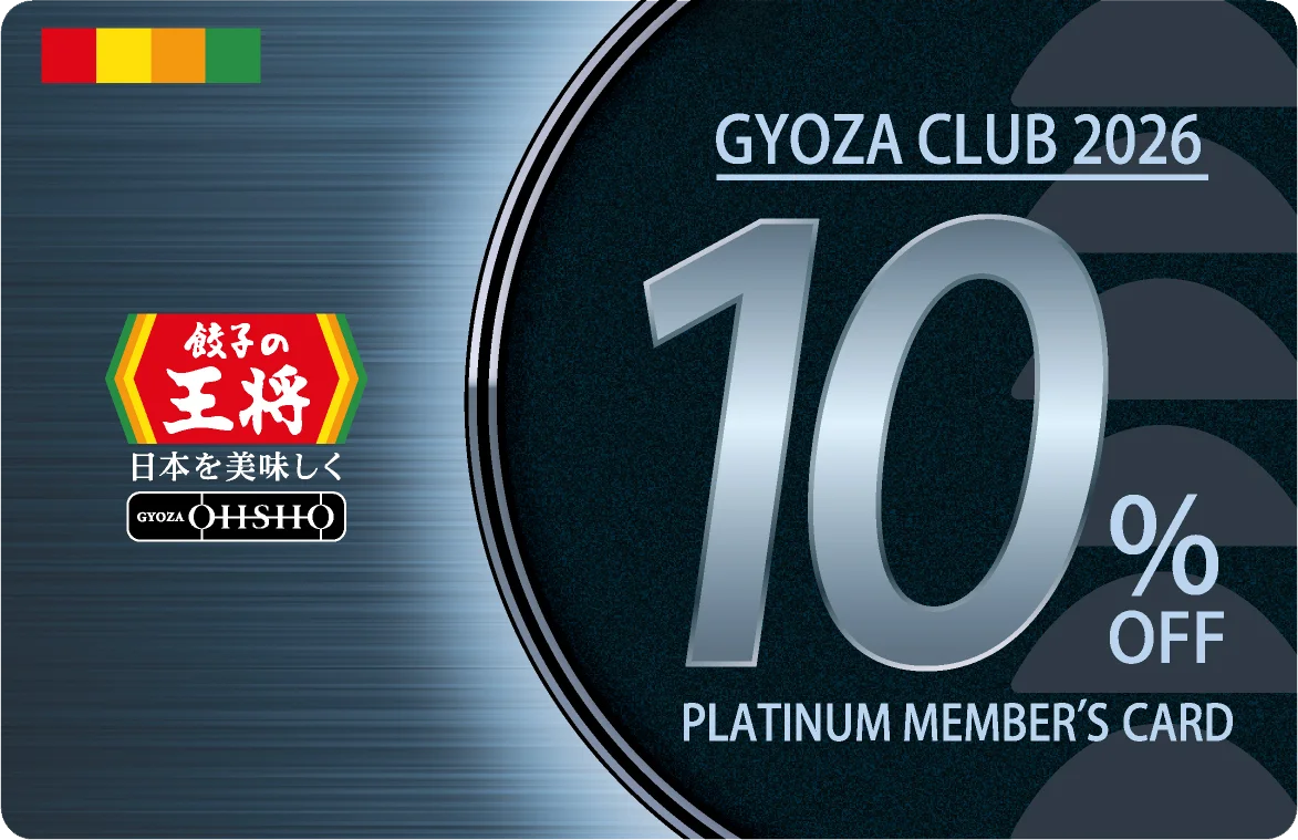 - ゴールド会員カード取得後にさらにスタンプ50個を集めると:ぎょうざ倶楽部プラチナ会員カード(お会計10%割引)+税込250円割引券 4枚