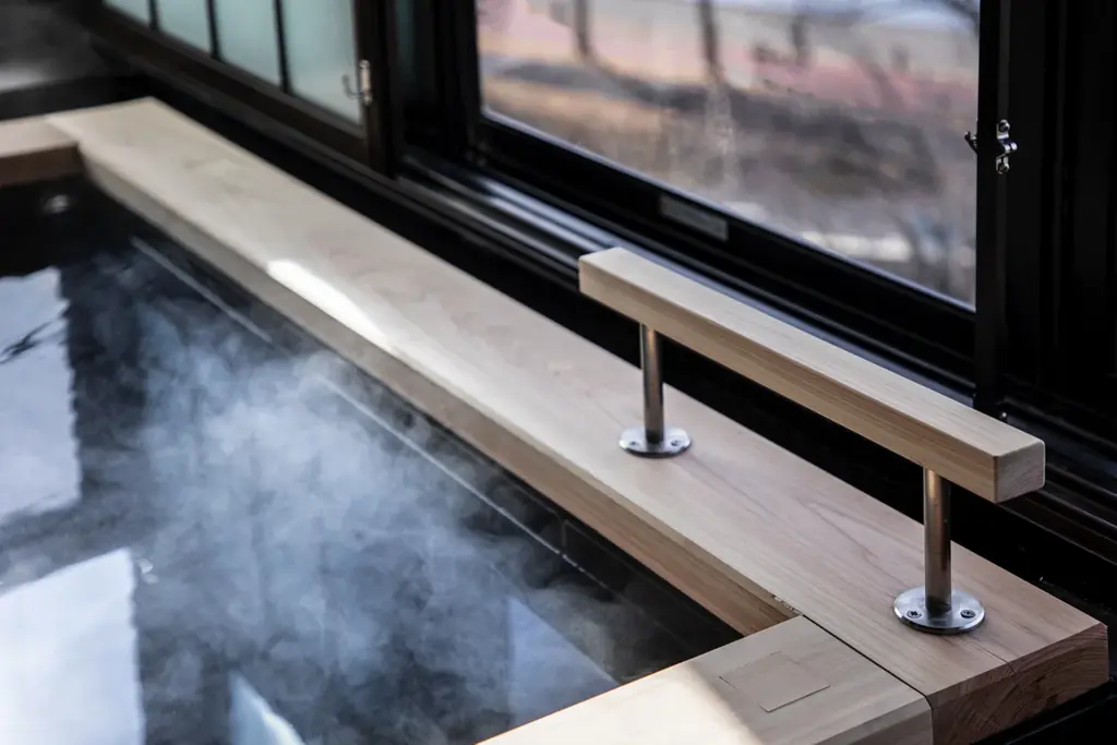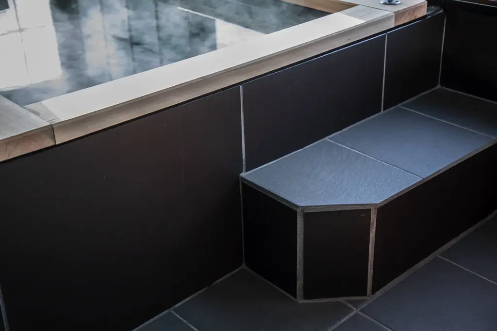改修の主要な狙いは、耐久性と安全性の向上、そして湯船への出入りや湯浴みのしやすさを高めることです。従来の檜浴槽を石造りに変更するとともに、浴槽周りの石畳化、手すりの設置、ステップの新設などを行いました。ワイドタイプとスタンダードタイプで実施内容に差があり、それぞれの利用想定に合わせた設えが施されています。