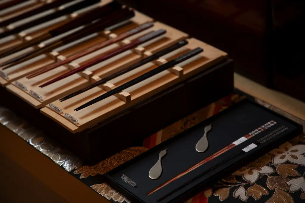 夕食時に館が用意する3種の木曽漆器の中から一膳を選び、そのまま個室料亭で利用します。使用後は館内のお土産処にて同じお箸を購入することが可能です。体験は無料で提供され、購入する場合は別途費用が必要となります。
