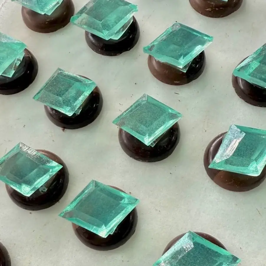 大分県産かぼすを丸ごと搾った果汁を使用。エメラルドグリーンの宝石を思わせるカッティングで、爽やかさと華やかさを併せ持つ一粒です。 - 福岡生姜 × ダークチョコレート