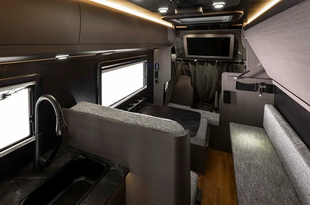 インテリアは長期滞在を前提に家具や収納を配置しており、生活導線を意識した作りとなっている。シンクや冷蔵庫の配置、取り外し可能なバーナーなどにより屋内外の調理動作を想定した使い勝手を提供する。
